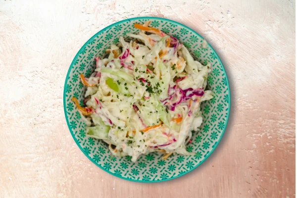 Freshly shredded carrots, red and white cabbage with Moza’s whip, seasoned with salt and pepper.