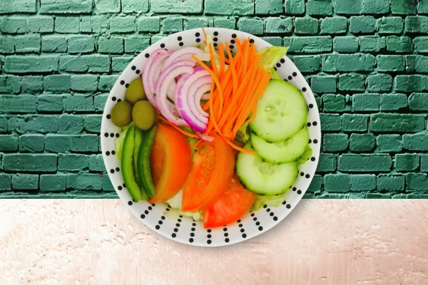 Lettuce, cucumbers, red onions, tomatoes, carrots, and olives